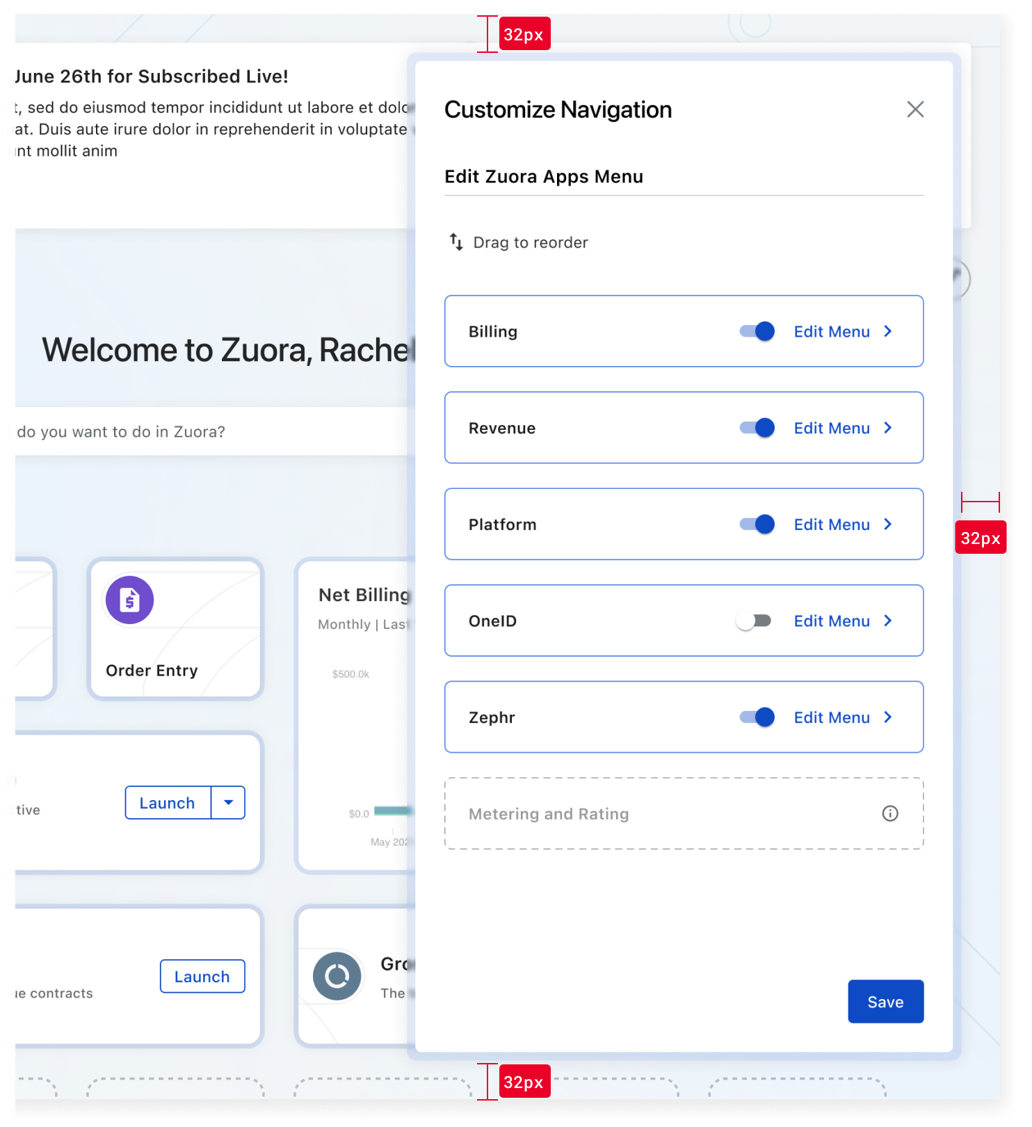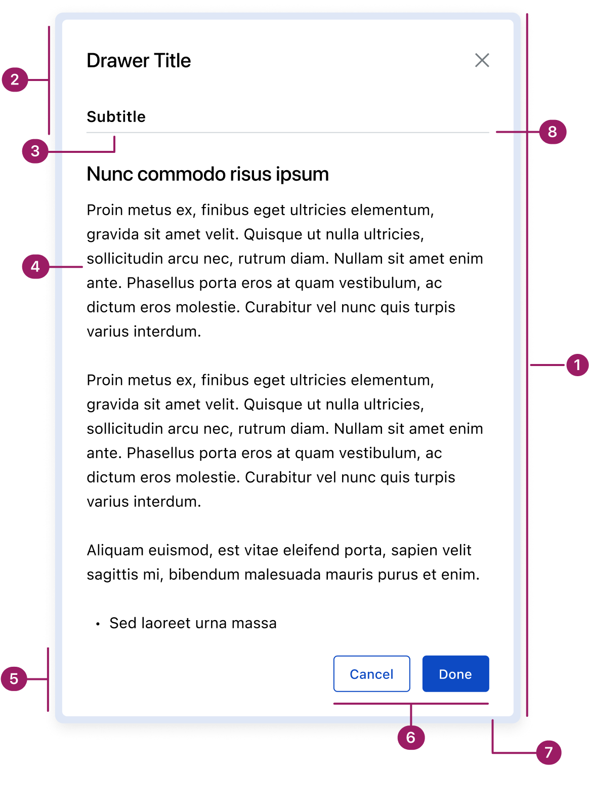 Drawers slide in from the right edge of the screen. They are positioned 32px from the top, bottom, and right edges of the screen. This spacing ensures visual balance and prevents overlap with fixed actions or UI elements near the screen edges.