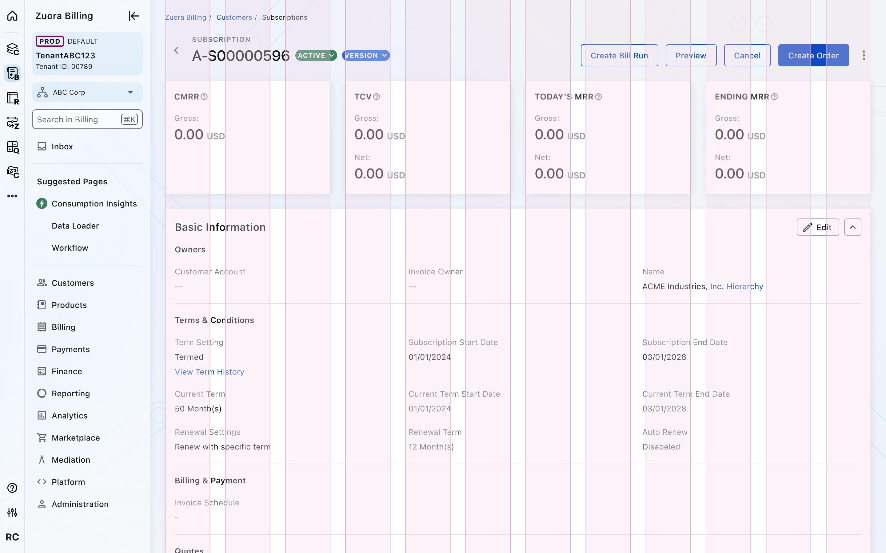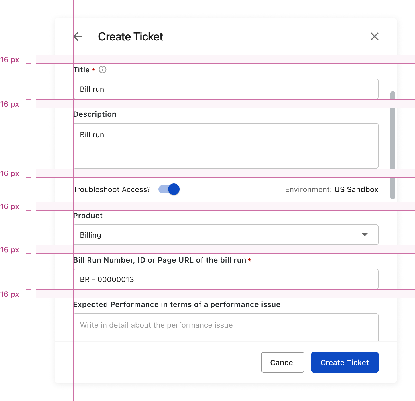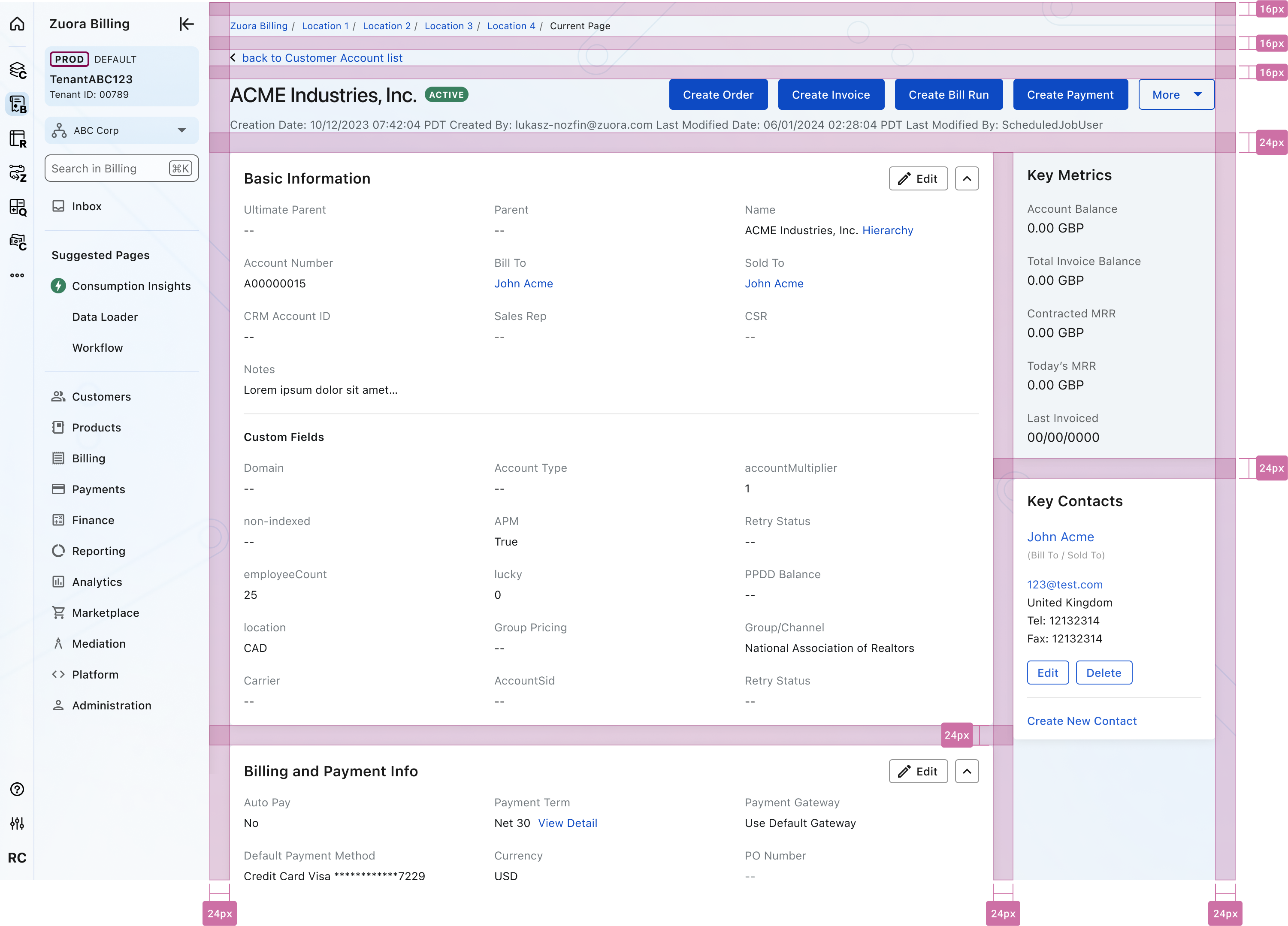 Layout and spacing define how elements are arranged and proportioned within a design, ensuring clarity, hierarchy, and an intuitive user experience. In Occam, these guidelines simplify Zuora’s complex functionality and minimize visual clutter to provide graphical structure, seamless navigation, and clear readability.